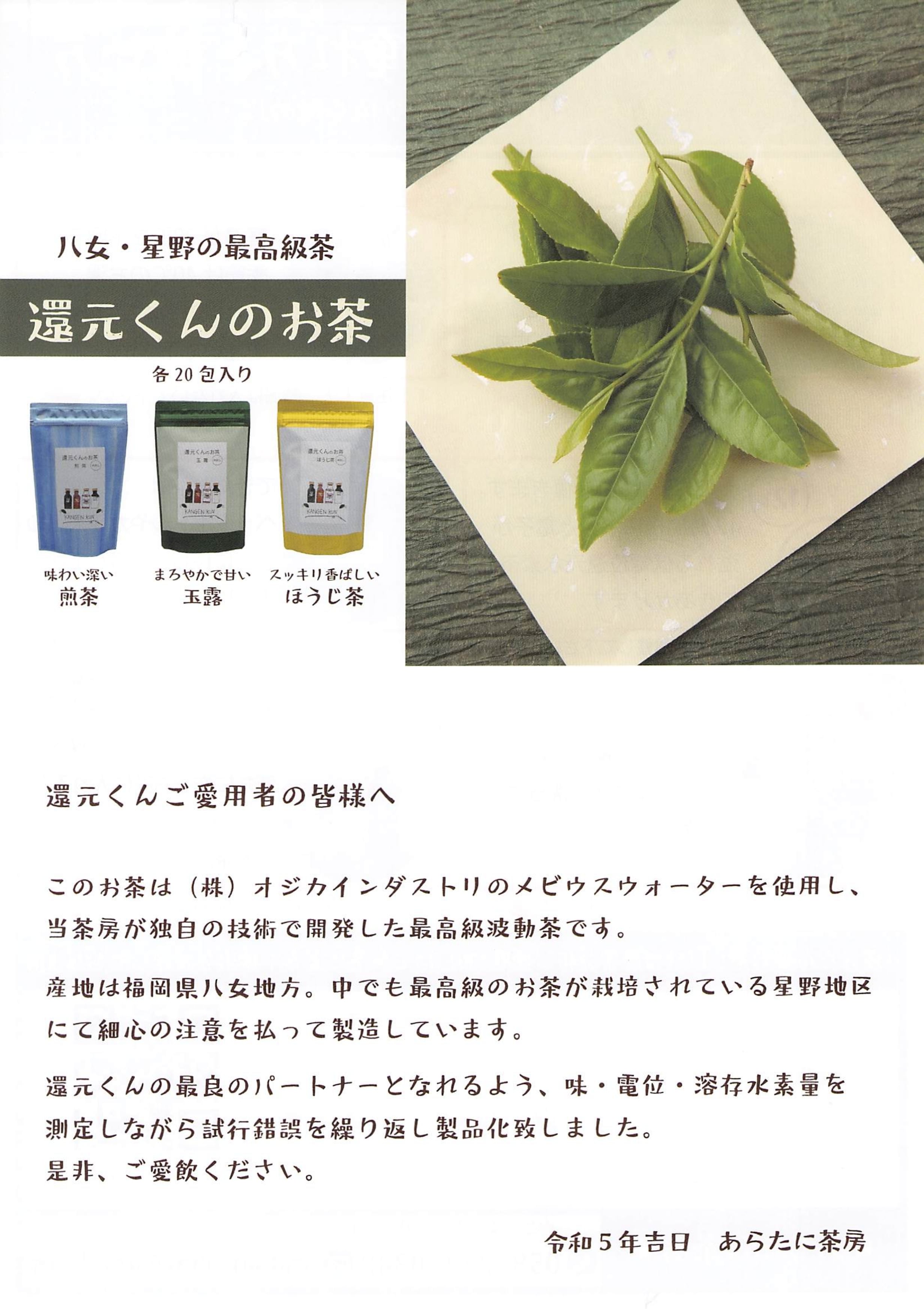 そんな想いをもった 「あらたに茶房」さまがお茶の美味しさを最大限に引き出すため、メビウスウォーターを特殊製法で含有させて独自に開発した還元くん専用の最高級波動茶です。
